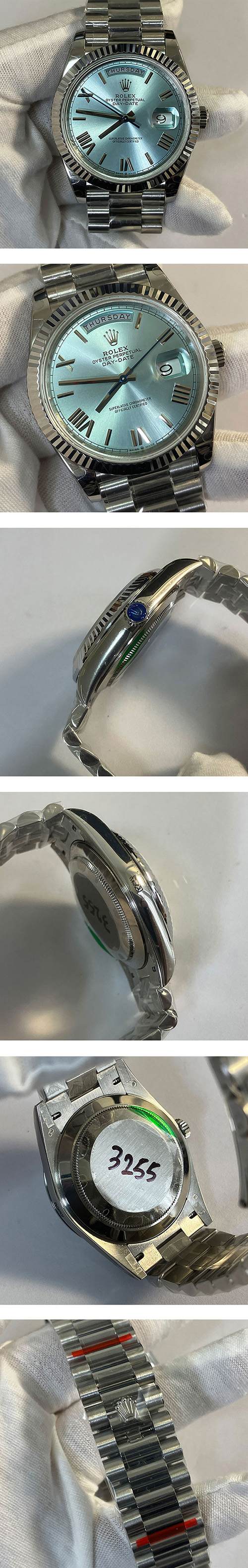 ムーブ : 自動巻き(3235ムーブメント搭載) 文字盤 : アイスブルー文字盤 素 材 : 904L高強度ステンレススチール使用 風 防 : ARコーティングされた傷防止サファイアクリスタル(裏蓋は密閉式) ベルト : 3連ジュビリー(904L高強度ステンレススチール 、Dバックル搭載) サイズ : ケース直径40mm、 厚み12mm